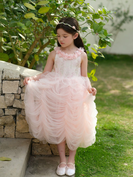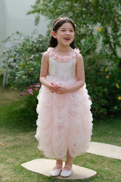 Gentle blush hues, floral accents, and a softly gathered ruched skirt come together to create a whimsical and graceful look.